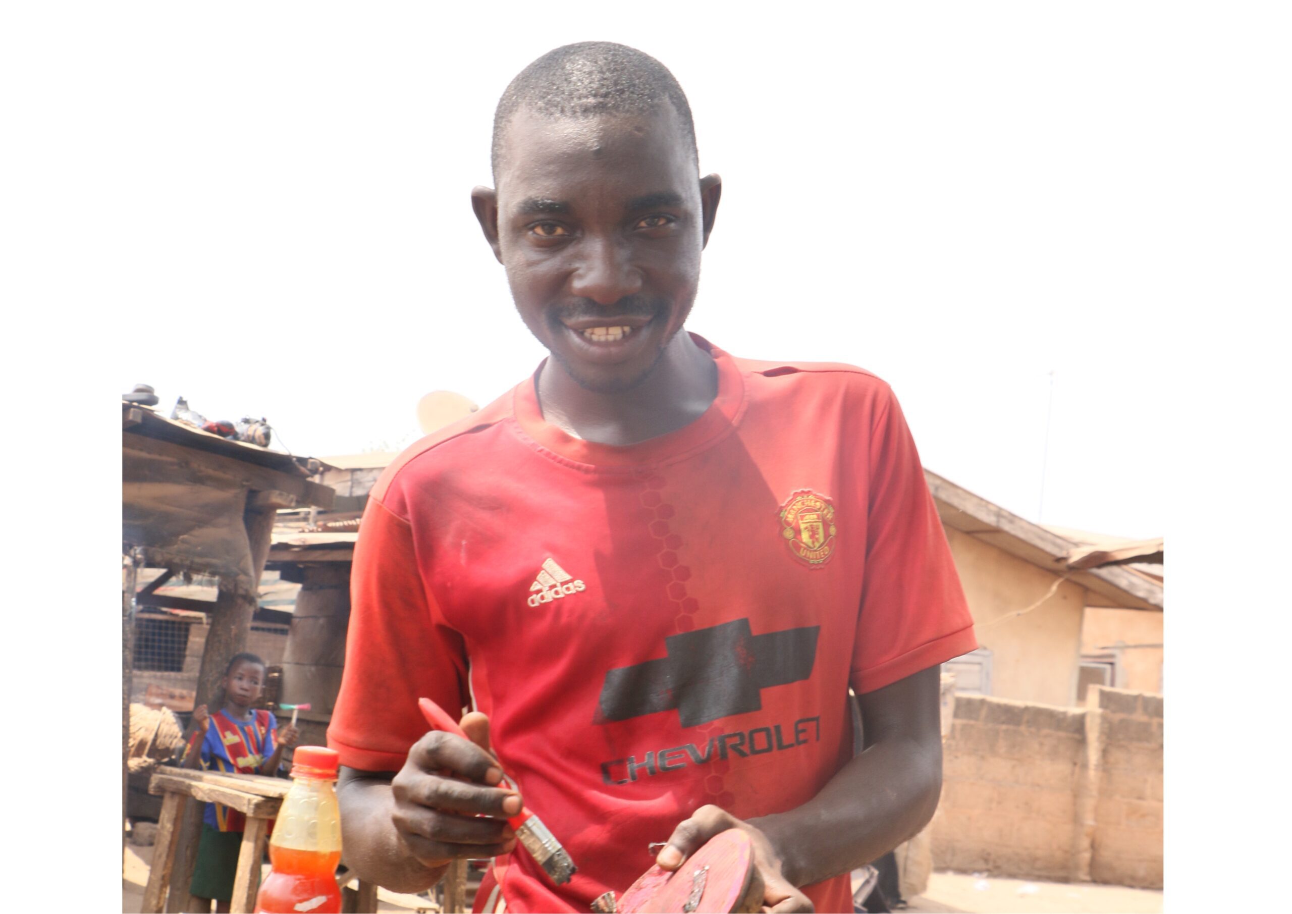 Abdul Fatai made haste to arrange his wears; neatly displayed on the 4 layers wooden shelf are handmade leather sandals, he pulls each out and wipes the edges with a rough dusty piece of cloth. Fatai looks cheerful and satisfied as he paced slowly; holding up his left knee to support his movement, his inability to walk upright does not deter his determination to unleash his potential and work towards his childhood dreams.